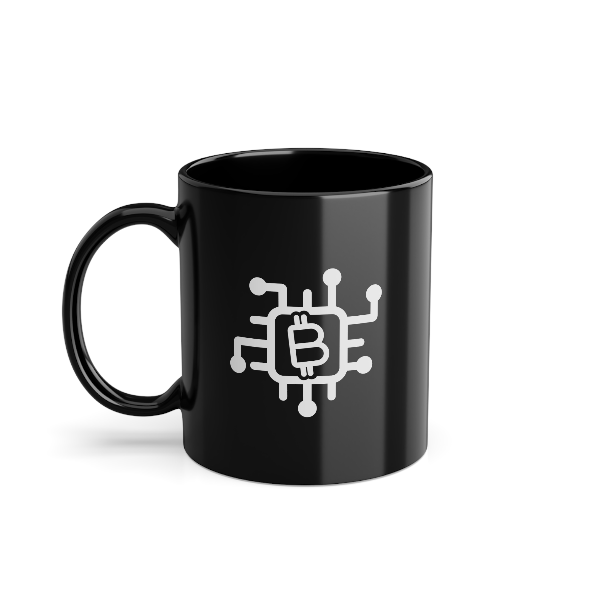 A sleek black ceramic Mug with a glossy finish featuring a minimalist bitcoin processor design. Perfect for cryptocurrency enthusiasts or fans of the show looking to add a unique touch to their morning coffee routine. Great for gifting during holidays like Christmas or birthdays.