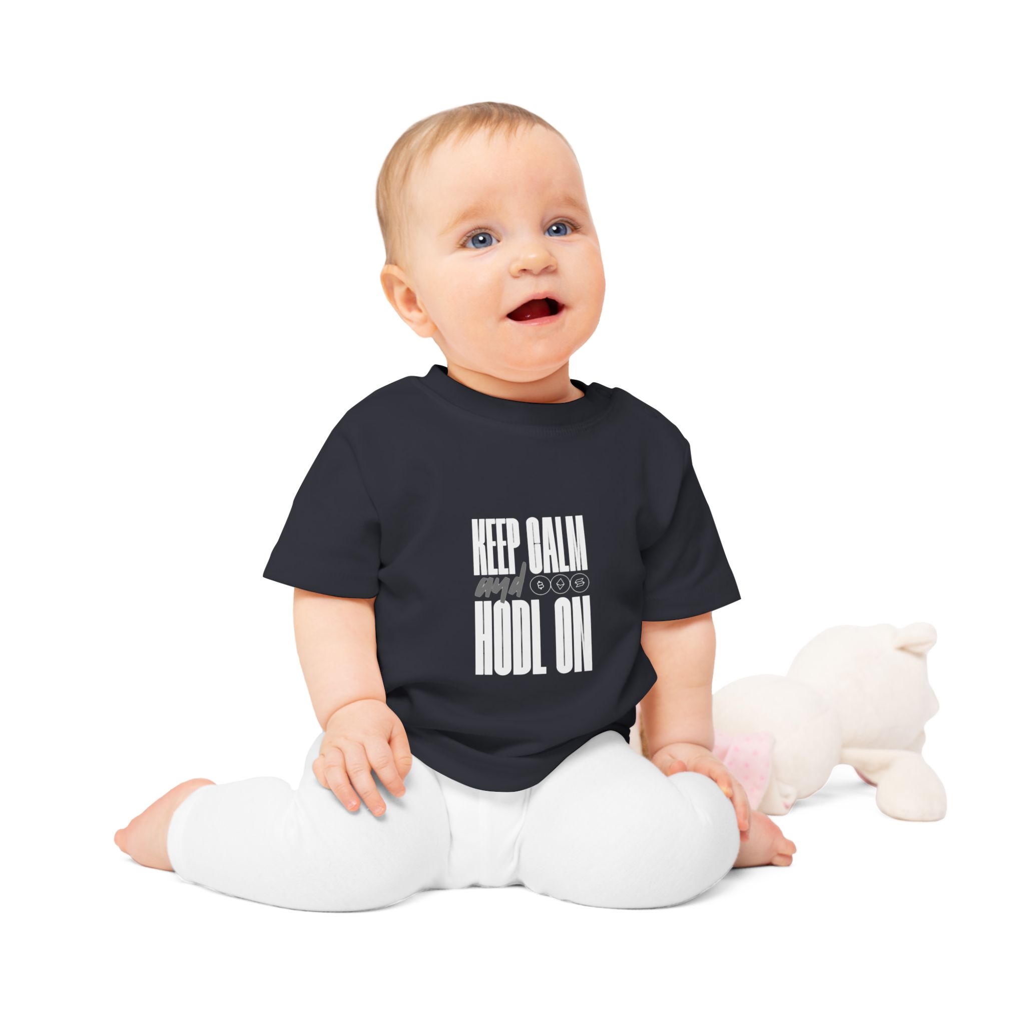 Keep your baby stylish with the Keep Calm and HODL On Baby T Shirt! Perfect for young crypto fans.